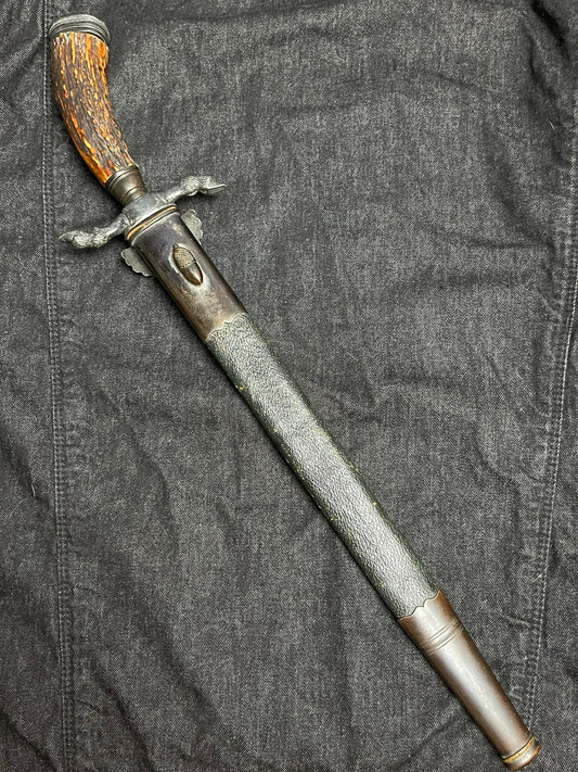 GERMAN WW2 NATIONAL HUNTING ASSOCIATION ‘DEUTSCHE JÄGERSCHAFT’ TRIPLE ETCHED HUNTING DAGGER W/ LEATHER SCABBARD
