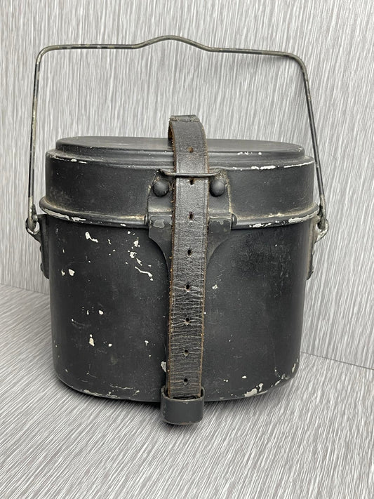GERMAN WW2 1940 MATCHING BLACK PAINTED MESS KIT W/ MARKED LEATHER STRAP
