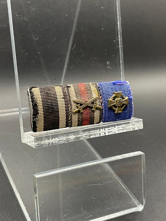 GERMAN WW2 3 PLACE RIBBON BAR EKII 1914-18, HINDENBURG CROSS W/ SWORDS, 25 YEAR FAITHFUL SERVICE