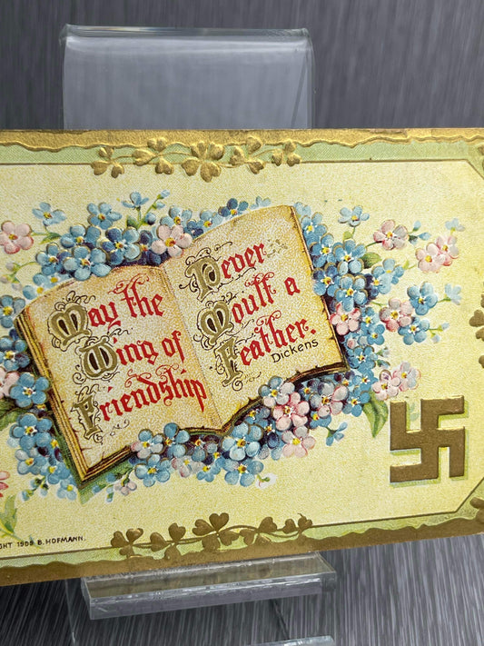 PRINTED IN GERMANY US 1910 GREEN 1 CENT WASHINGTON STAMP VICTORIAN STYLE POSTCARD WITH GOLDEN SWASTIKA RARE!