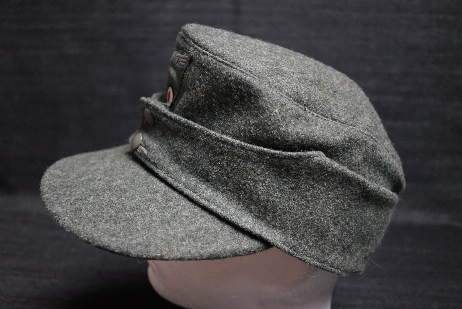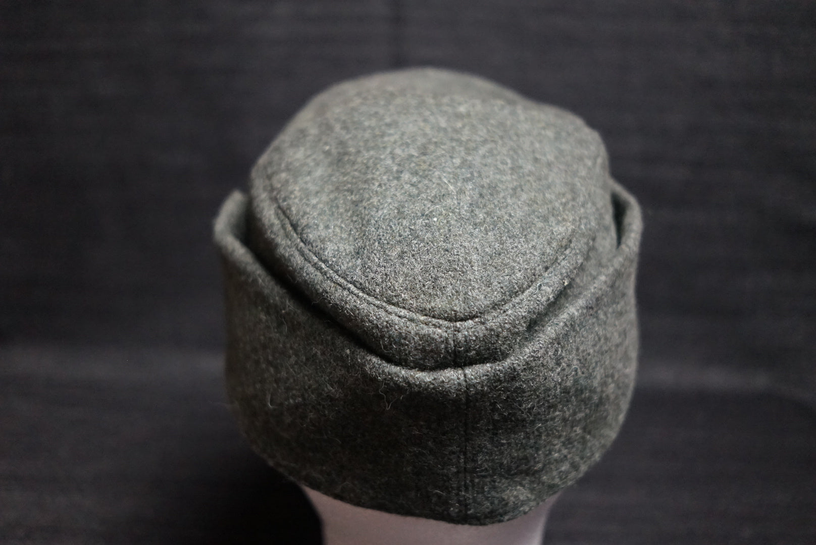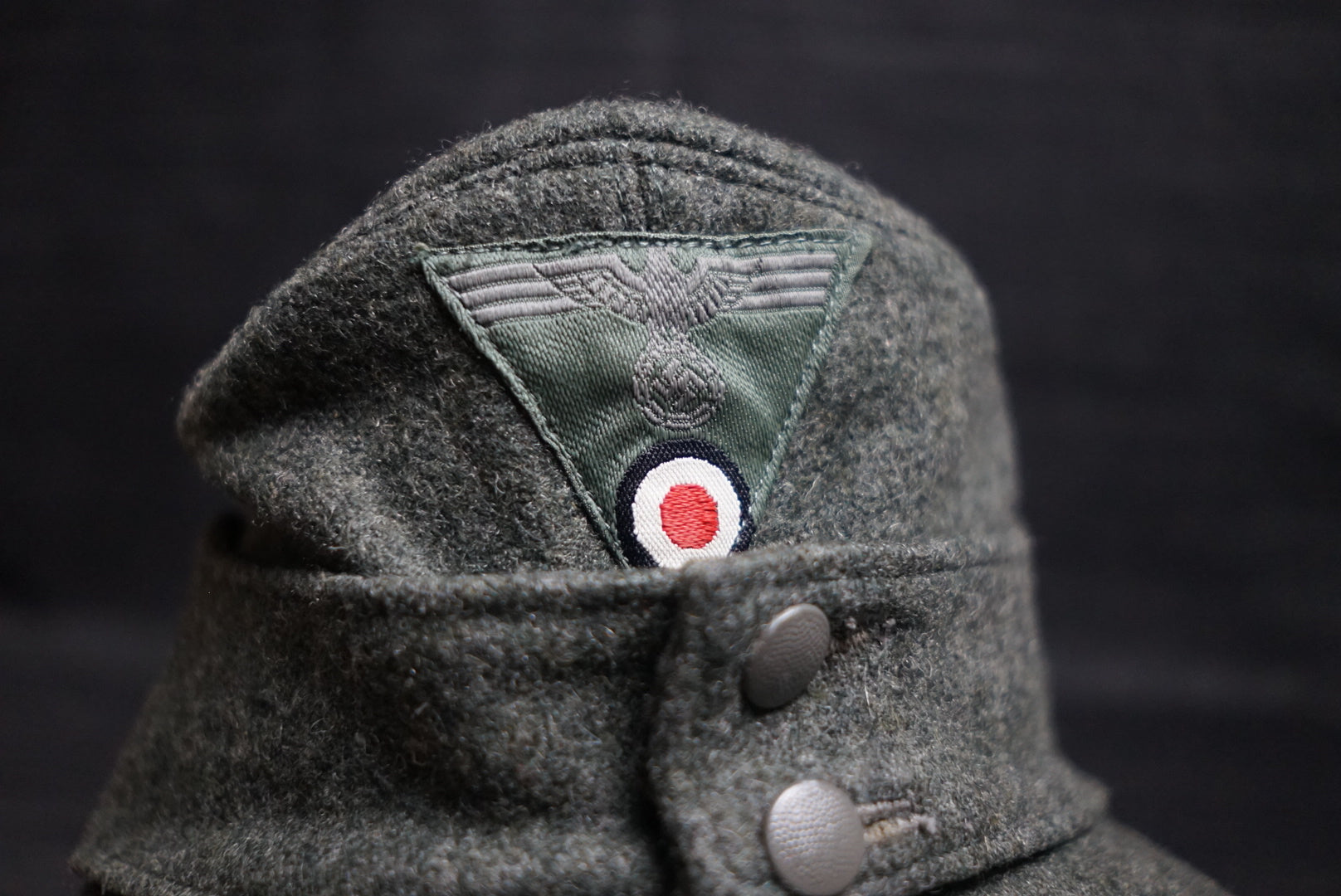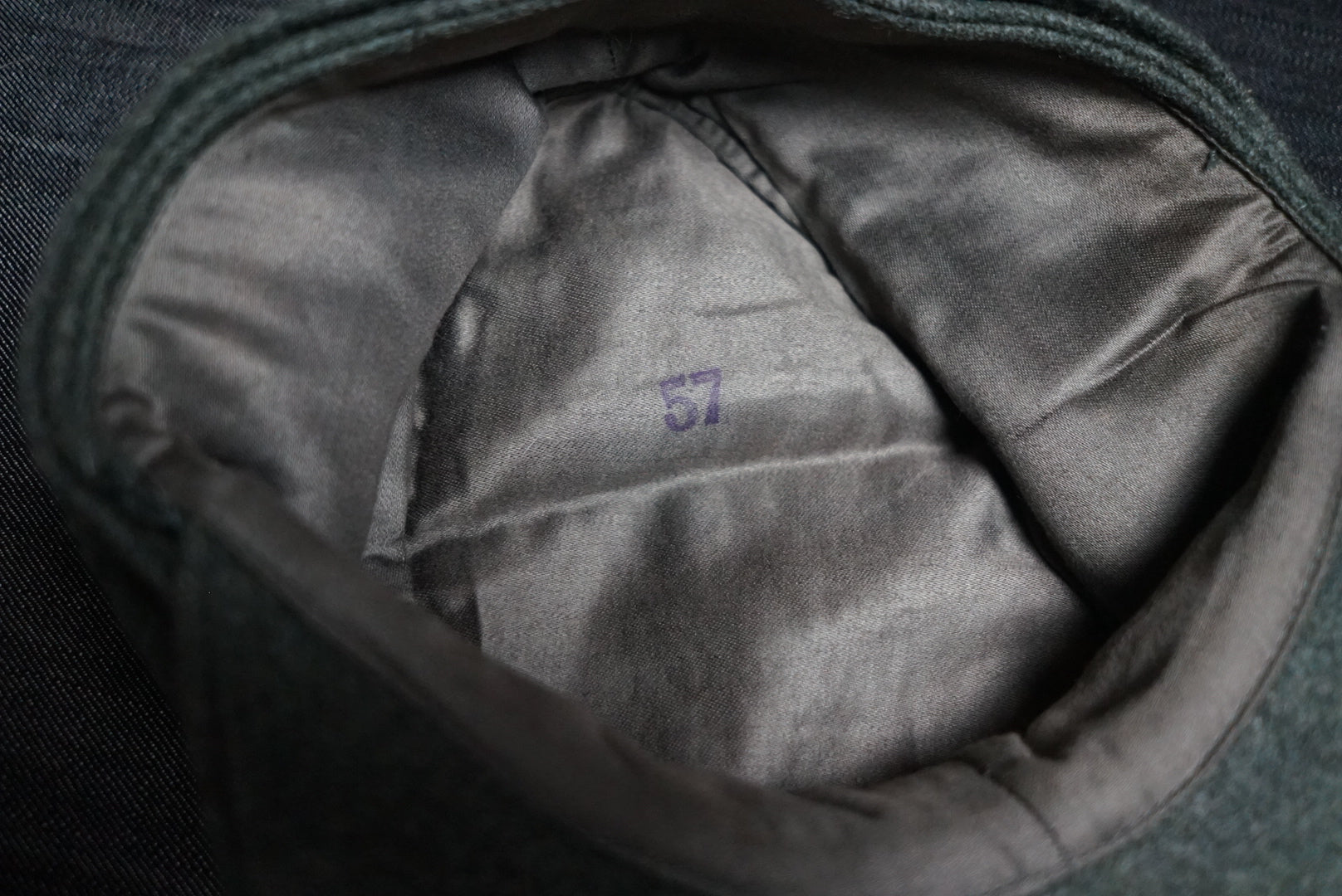 Field grey wool construction with a factory applied trapezoid style insignia. Inside is lined with artificial silk (rayon) and bears an ink stamp for size 57. Very clean and in a good condition.