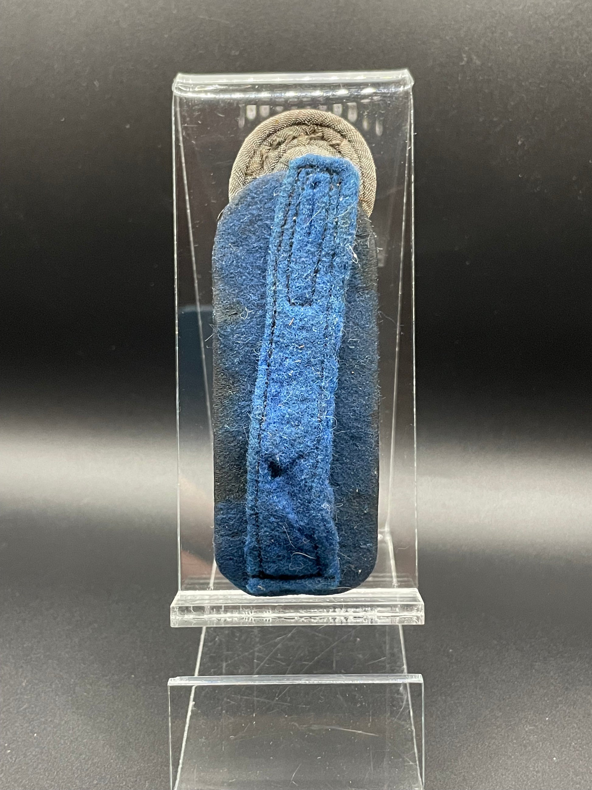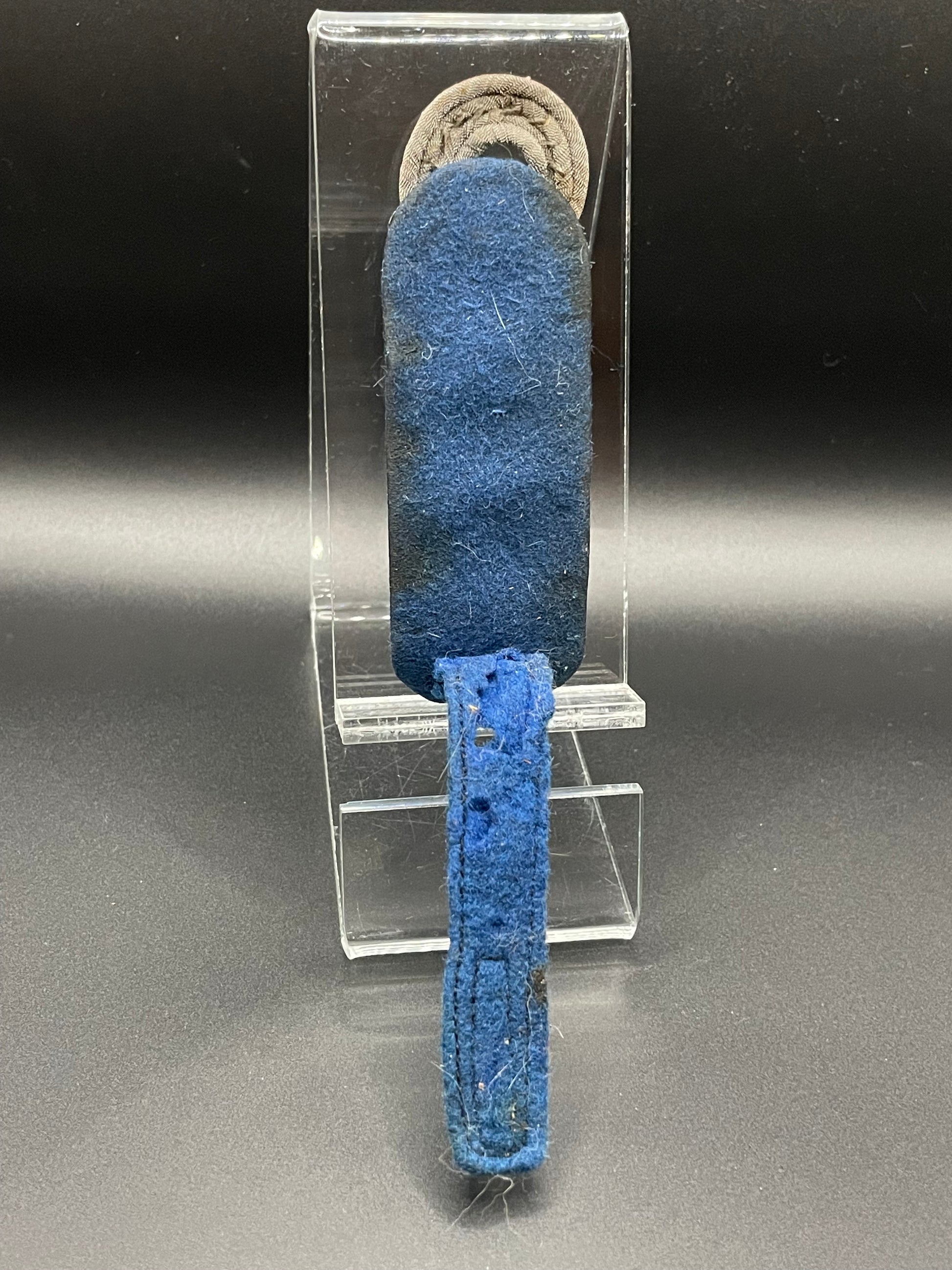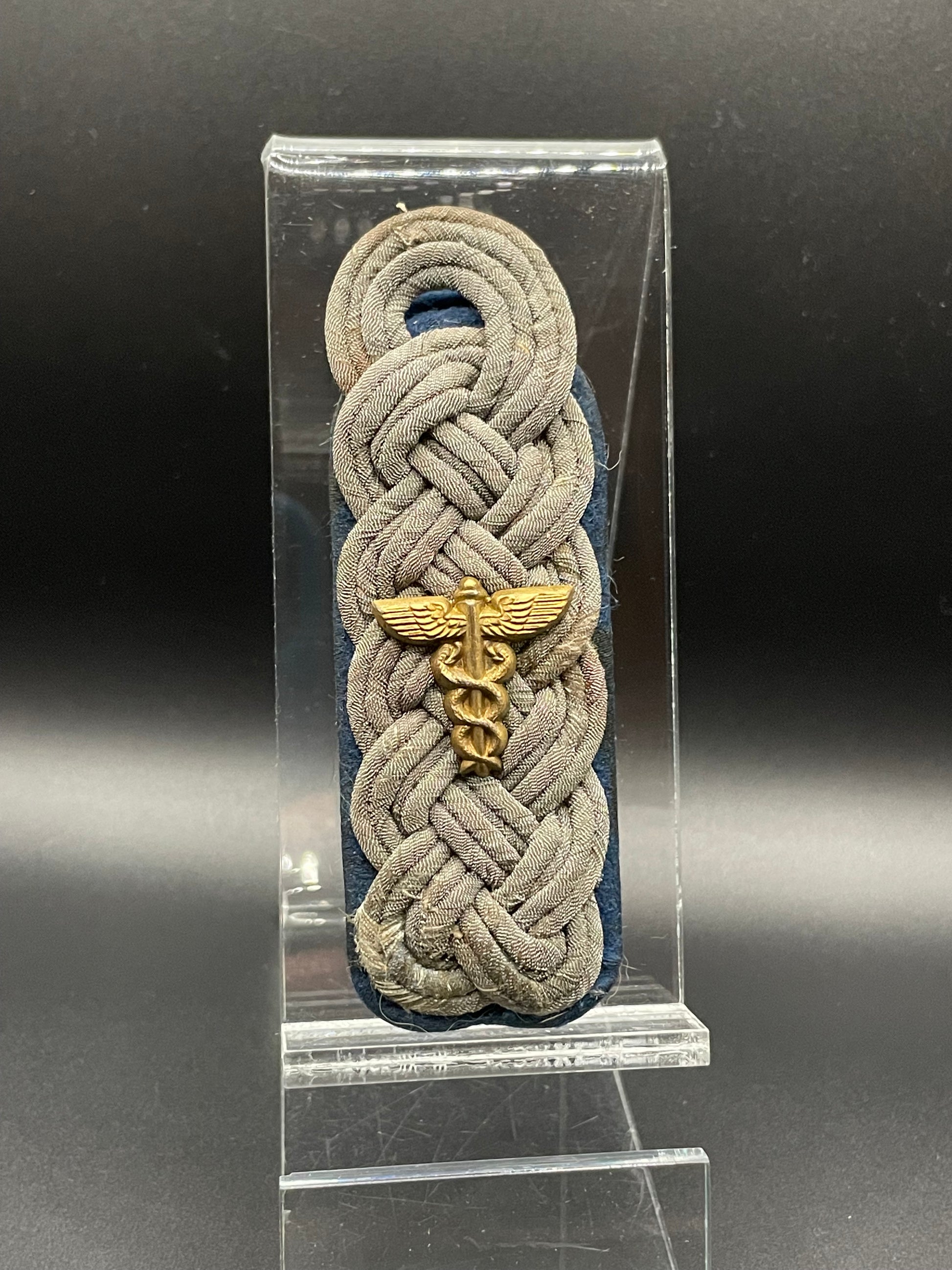 ”Russian” style braiding with die stamped gilt metal caduceus mounted on a royal blue wool waffenfarbe backing.