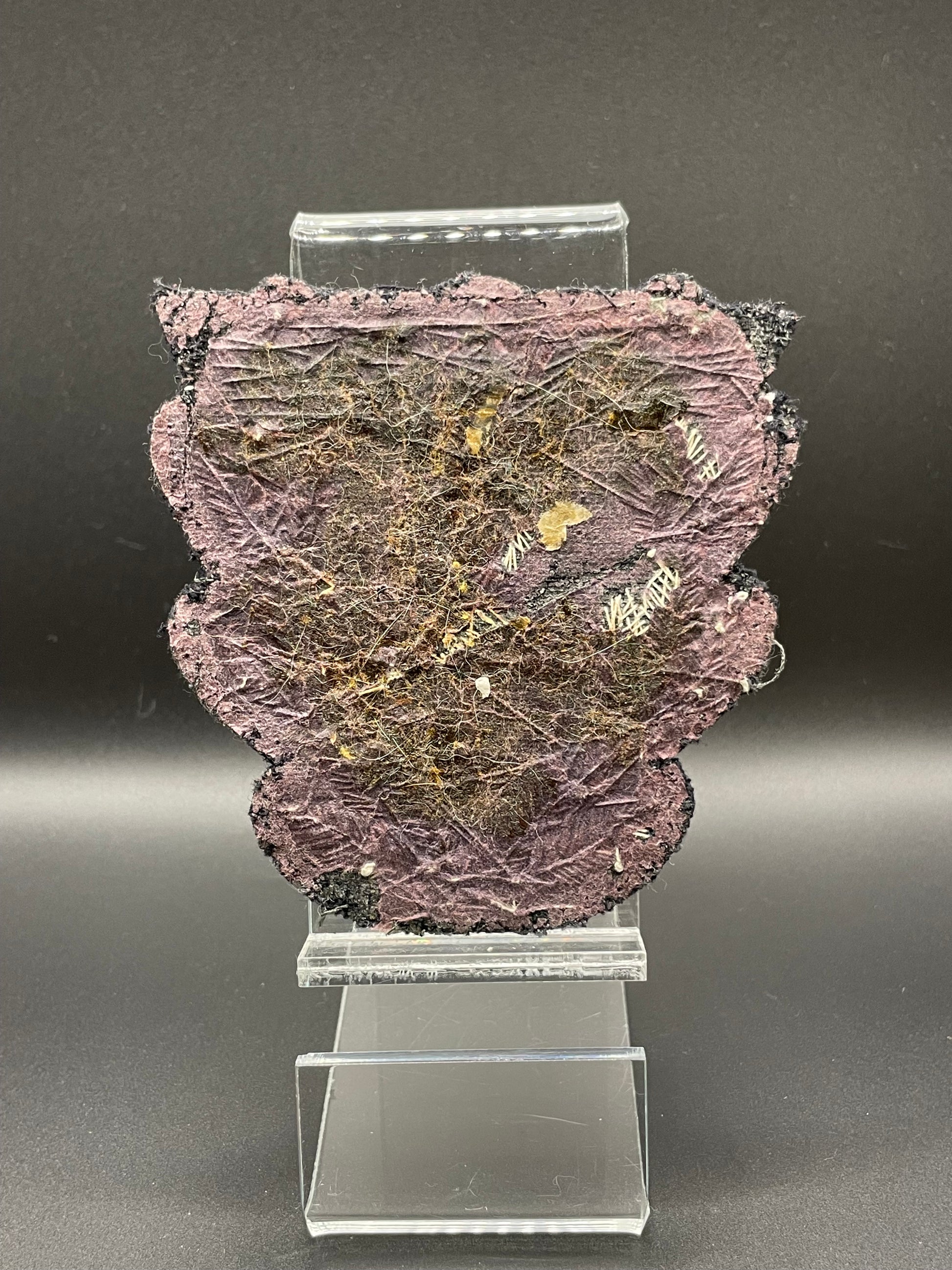 Hand embroidered in gold bullion on black wool. Complete with original purple paper backing.